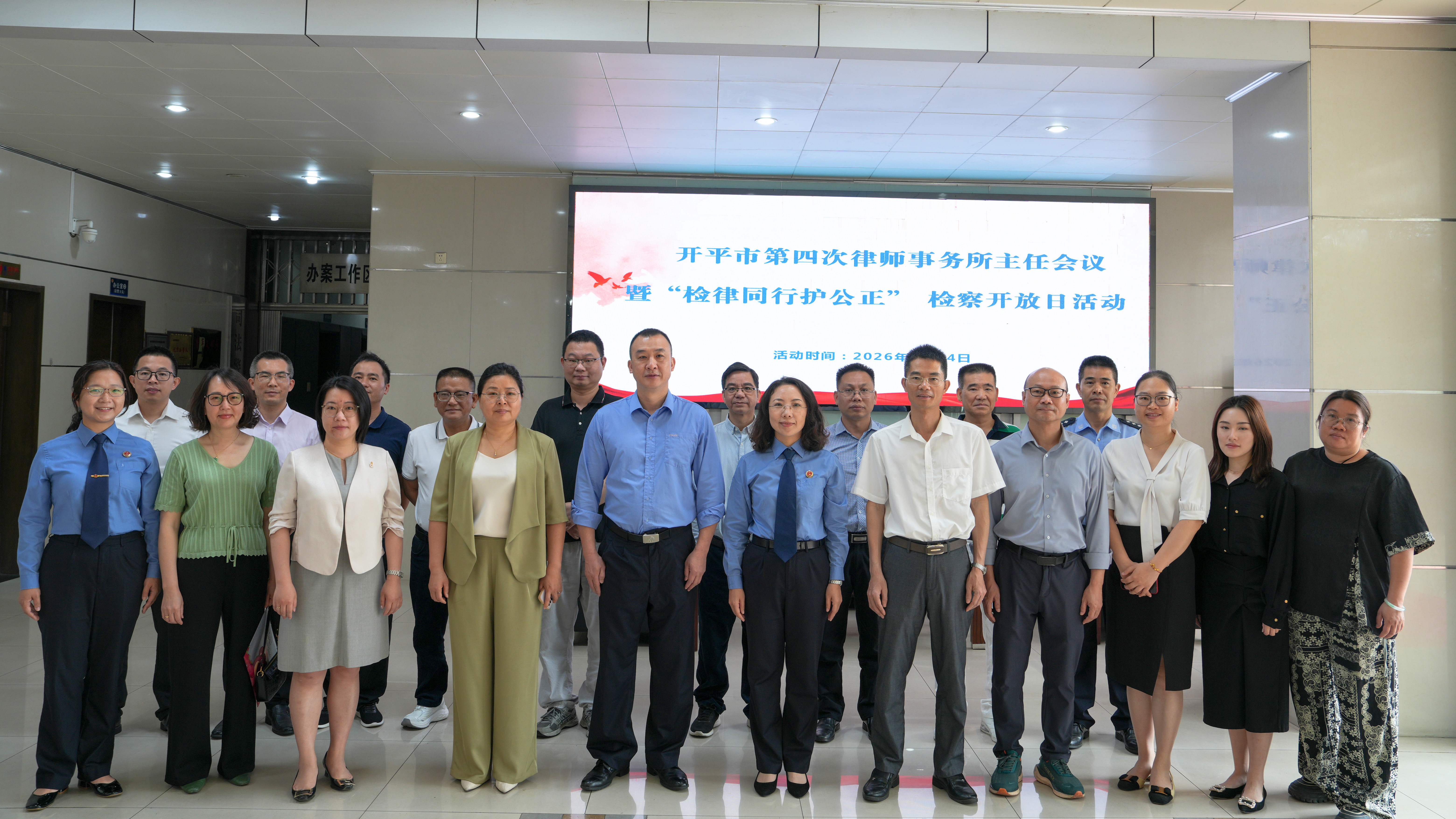 为深入贯彻党的二十大和二十届历次全会精神,全面落实“十五五”规划关于全面依法治国的部署要求,进一步加强政法单位与律所、律师之间的沟通协作,深化法律职业共同体良性互动,3月24日,开平市司法局、开平市人民检察院联合举办的开平市第四次律师事务所主任会议暨“检律同行护公正”开放日活动在开平市人民检察院举行。开平市委副书记、政法委书记梁毅渝,市人民检察院党组书记、检察长黎欢琼,市司法局党组书记、局长林上金,市委政法委、市人民法院、市公安局、市市场监督管理局分管领导和有关业务部门负责同志,以及全市13家律师事务所主任参加会议。